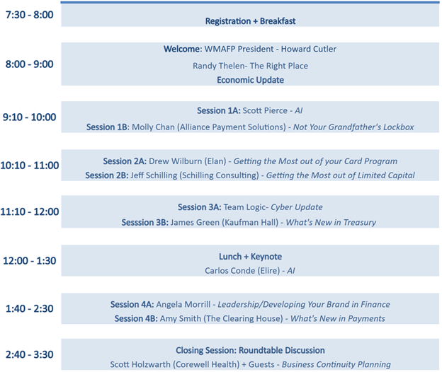 Join us for another educational and networking event at the Courtyard Marriott in Grand Rapids. The conference will focus on important topics in the industries of finance and treasury. We will have relevant breakout sessions and high-level keynote speakers. We hope you can join us and contribute to the conversations.